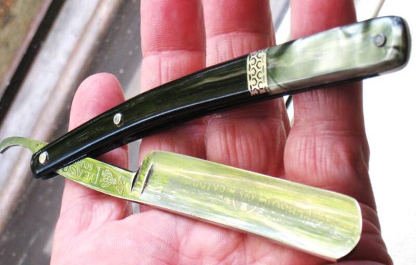 Mooie Parelmoer kleur op het scheerblad en op de handgreep van het scheermes.
