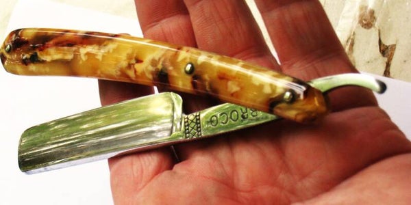 Goldfinch Broco hol geslepen 5/8 scheermes van carbonstaal.,met mooi celluloid gemarmert heft. uit het jaar 1940.