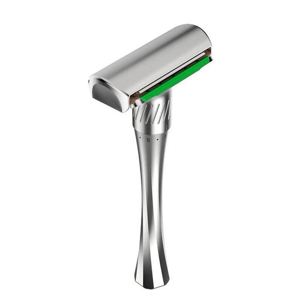 1/Green verstelbaar naar baardsterkte-(Adjustable ) roestvrij scheermes vaN 1 T/M 6-Hoe hoger het cijfer hoe milder het mes scheert-jekunt het het mes vestellen doormiddel van draaien aan de steel.Scheermesje inleggen-Haal de bovenkant van het mes los doormiddel van klik systeem-mesje inleggen aan het gedeelte waar 2 puntjes uitsteken-hierma het klepje we terug klikken (houdt deze aan de zijkant vast.