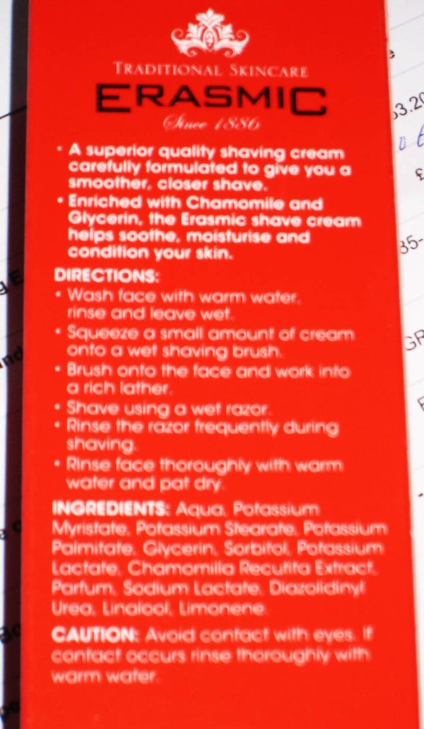 Erasmic geeft een rijk scheerschuim van superieure kwaliteit met kamille en glycerine om de baardharen heerlijk zacht te maken en de huid te verzorgen.