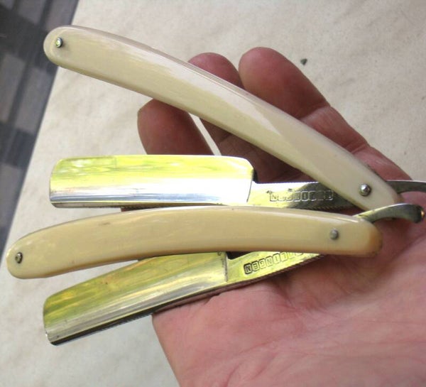 Holgeslepen 4/8 open scheermessen met celluloid handgrepen.