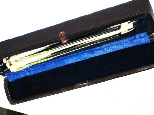 Mooi gebruikt scheerset bestaande uit 2 carbonstalen Solingen scheermessen in lederen etui uit de jaren 40,