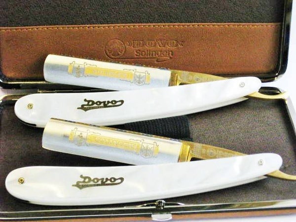 2 x Dovo immitatie parelmoeren carbonstalen 5/8 open scheermessen met 24 karaat goudetsing,