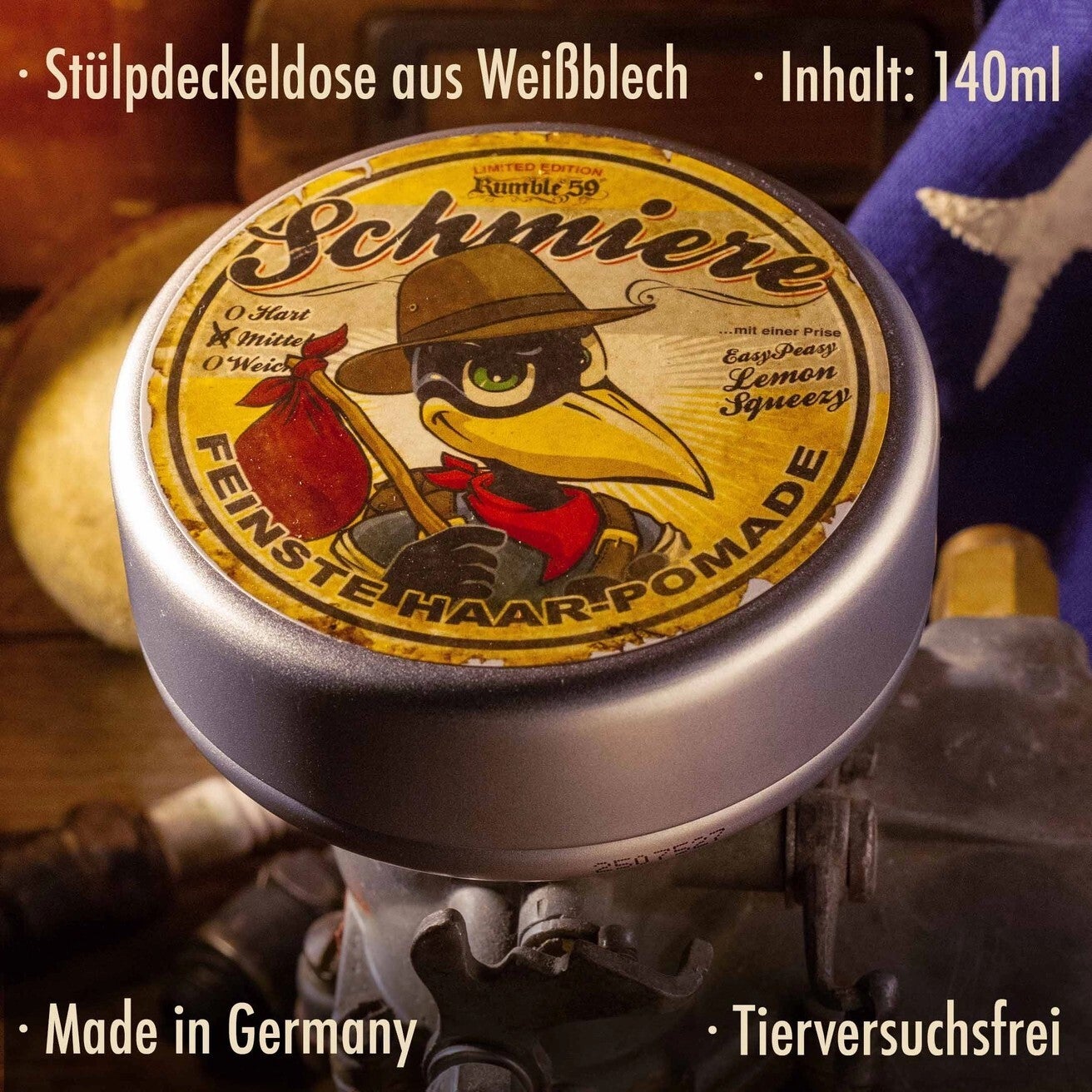 Deze pomade geeft een middelsterke houdbaarheid,heeft een wollig witte kleur en is Made in Duitsland.Het belangrijkste ingrediënt is een snufje ,,Easy Peasy Lemon ,,wat verantwoordelijk is voor frisse citroengeur en het gebruiksgemak.Laat je overtuigen door de verleidelijke geur en de verzorgende eigenschappen van de pomade.