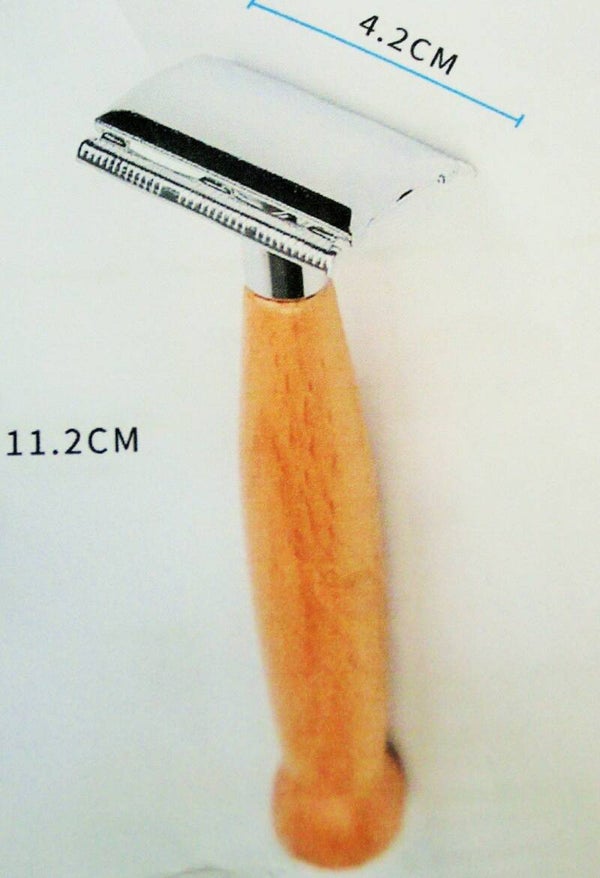 1/Dubbelzijdig scheermes (Double Edge)met beukenhouten handgreep en metaal/verchroomde scheerkop.