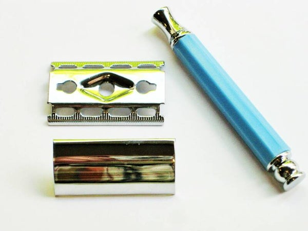 Roestvrijstalen scheermes met kunststof handgreep met lange schroef.