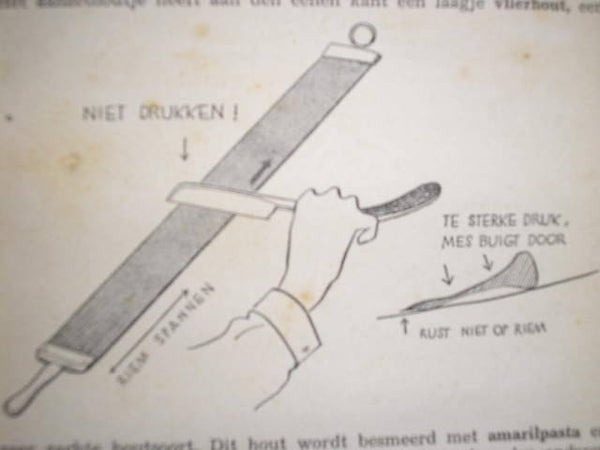 De canvastlaag om de scherpte te verfijnen-En een kunstleerlaag om het scheermes te slijpen.Te binnen bij de canvastzijde 20x heen en 20 keer terug.Eerst de rug van het scheermes ,dan het snijgedeelte (Het scheermes zo vlak mogen houden.Hierna 20x heen en 20 x terug op de kunstleerlaag).