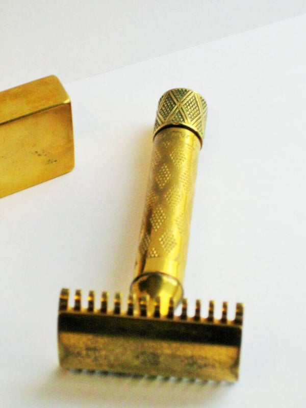 Antiek gebruikt Gillette New Standaard dubbelzijdig scheermes (Double Edge)+ Goldplated doosje om de scheermesjes in op te bergen.