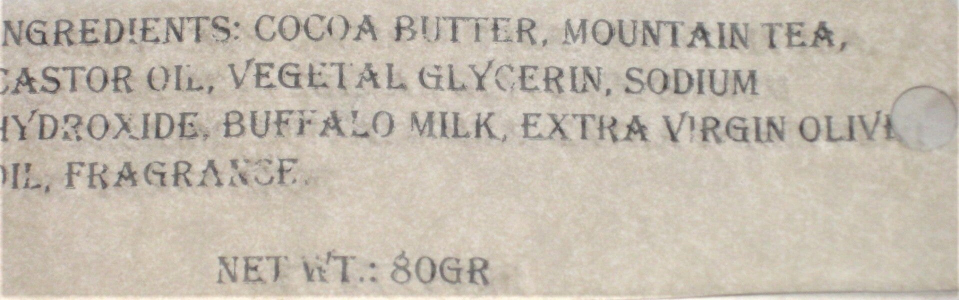 Met cacaoboter- bergthee-buffelmelk-Chelmos base 100% natuurlijk en ambachtelijk bereid.